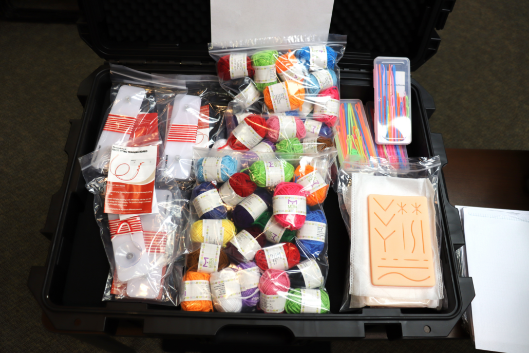 This tool box includes suture pads, yarn, plastic needles, and surgical knot boards.