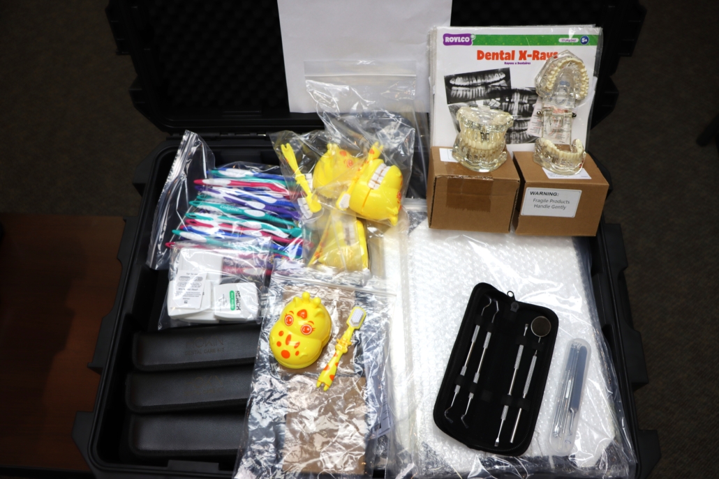 This tool box includes teeth models, dental tools, toothbrushes, and early educational dental materials.