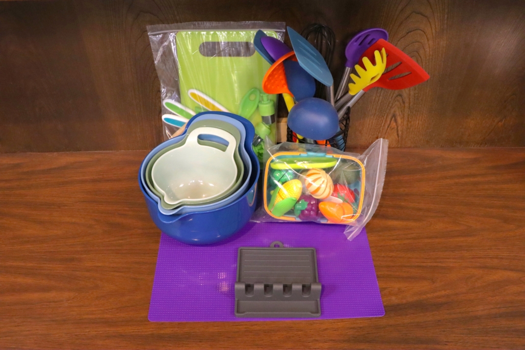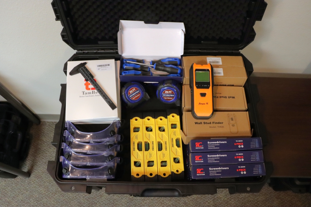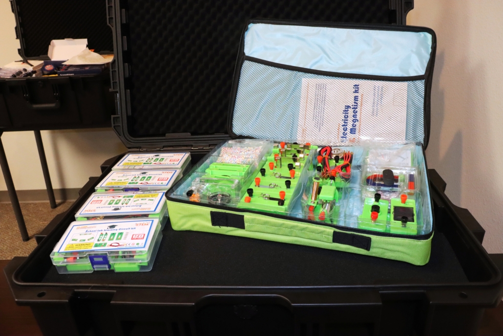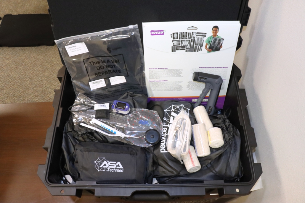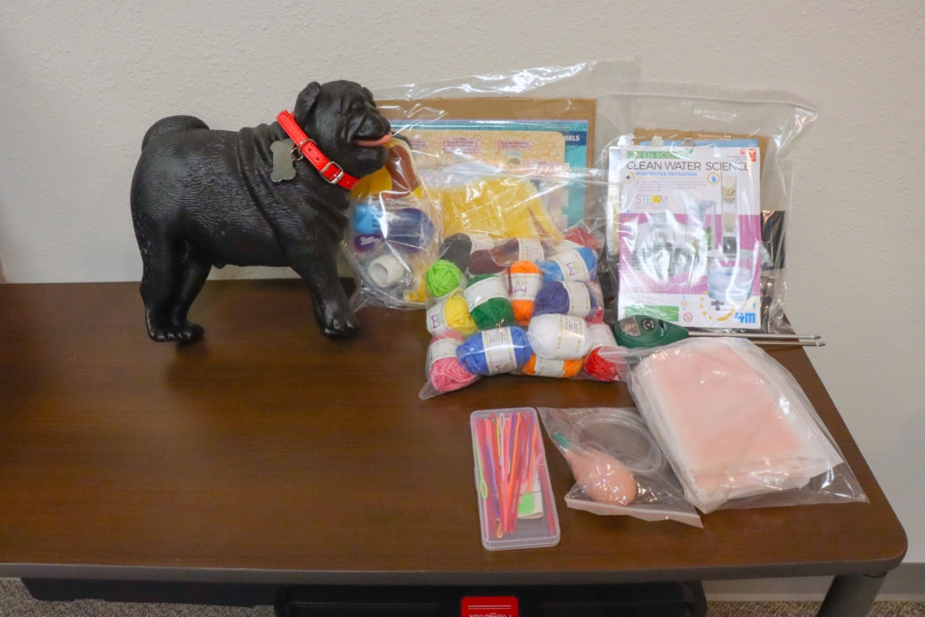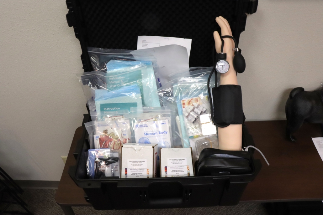 This tool box includes CPR dogs, suture pads, plastic needles, clean water science kits, soil test kits, and yarn.