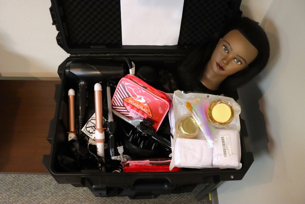 This tool box includes mannequin heads, makeup kits, esthetician kits, esthetician extraction kits, curling irons, curling wands, flat irons, and blow dryers.