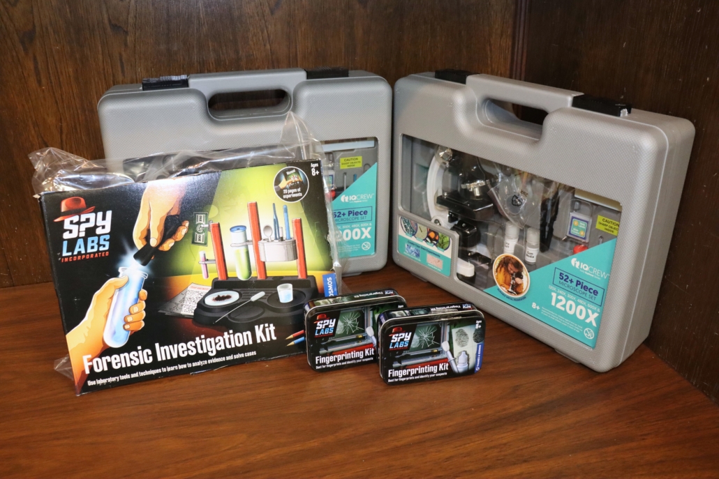 This tool box includes fingerprint kits, forensic investigation kits, and microscopes.