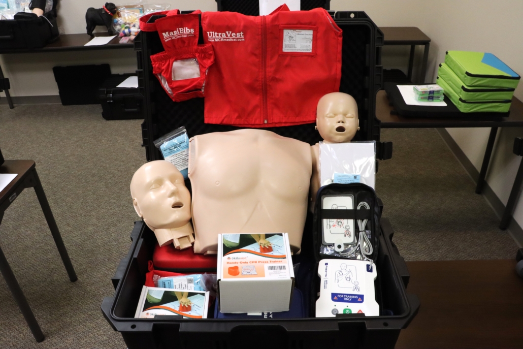 This tool box includes CPR models, AED trainers, and older CPR kits.