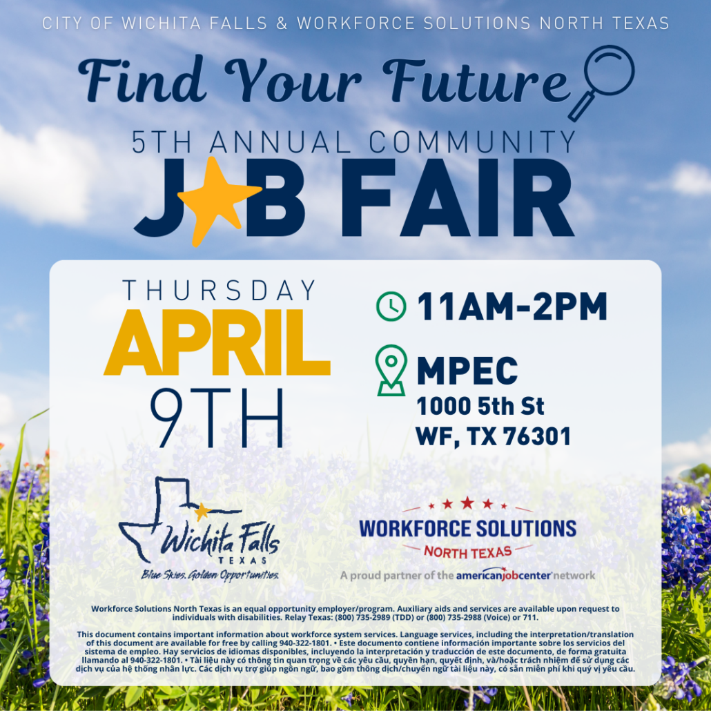Workforce Solutions North Texas is partnering with the City of Wichita Falls to help you Find Your Future at the 5th Annual Community Job Fair on Thursday, April 9.