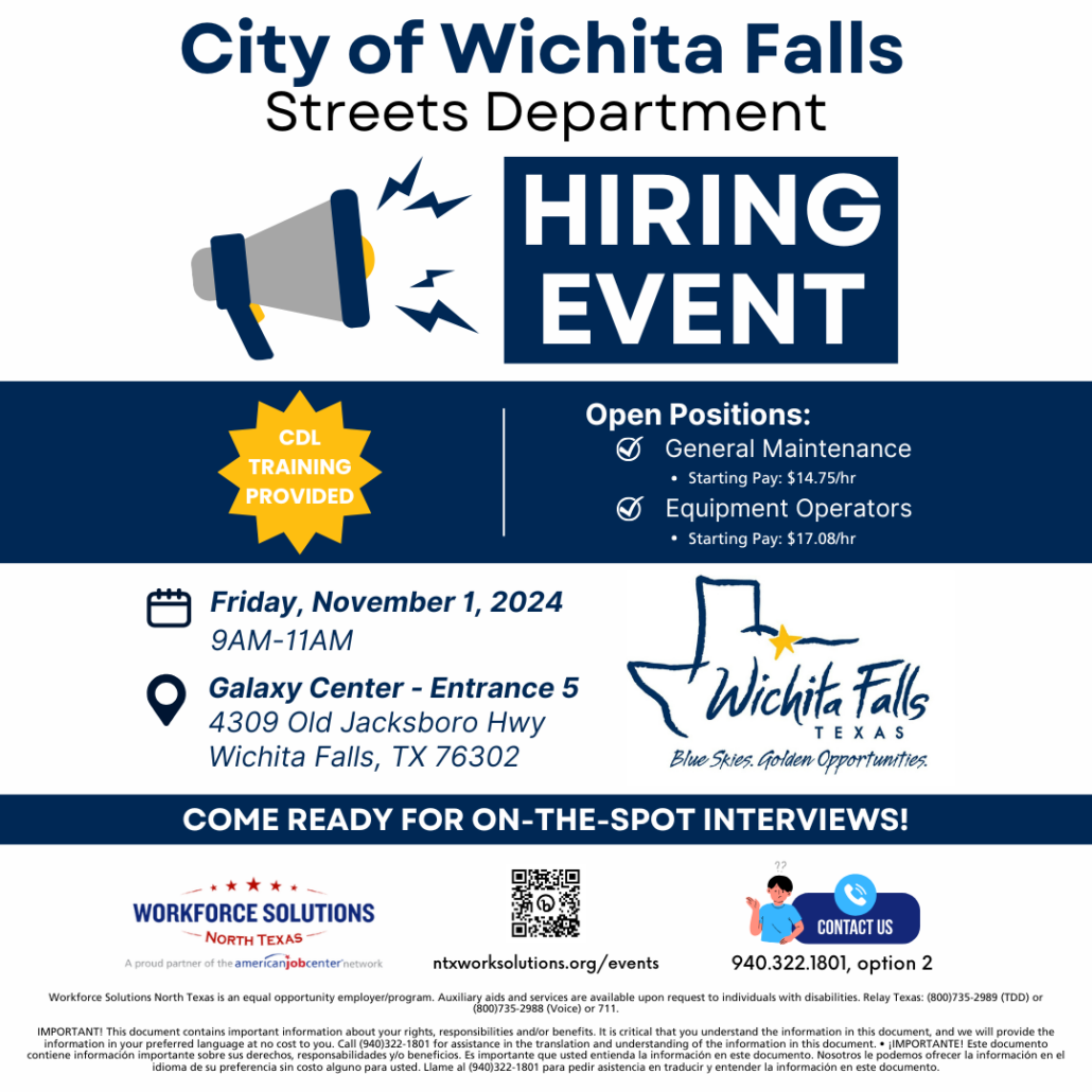 Attention job seekers! Workforce Solutions North Texas is partnering with the City of Wichita Falls for a Streets Department hiring event on November 1st!