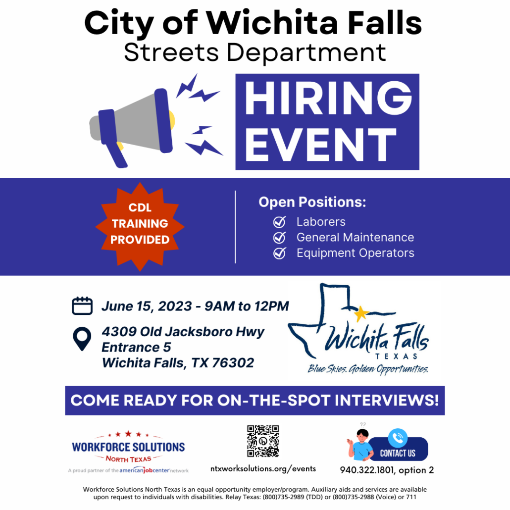 Workforce Solutions North Texas is partnering with the City of Wichita Falls for a Streets Department Hiring Event on June 15th, 2023.