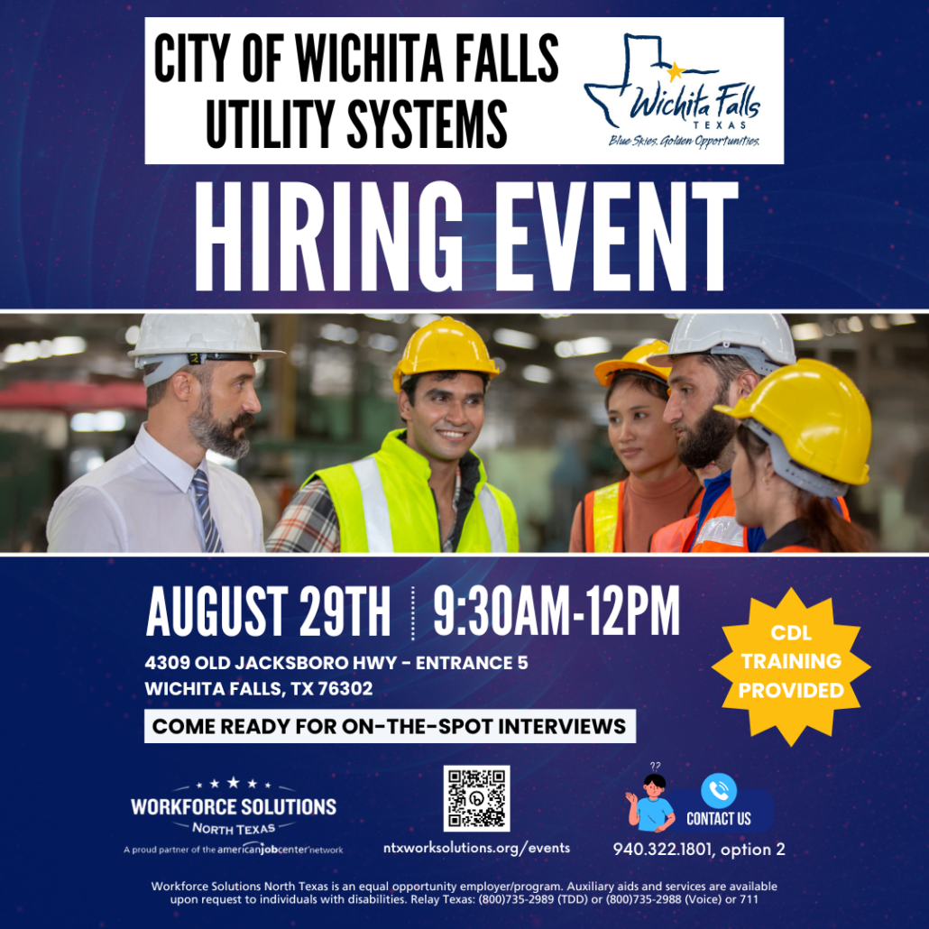 Grab your resumes! Workforce Solutions North Texas is partnering with the City of Wichita Falls for a Utility Systems Hiring Event.