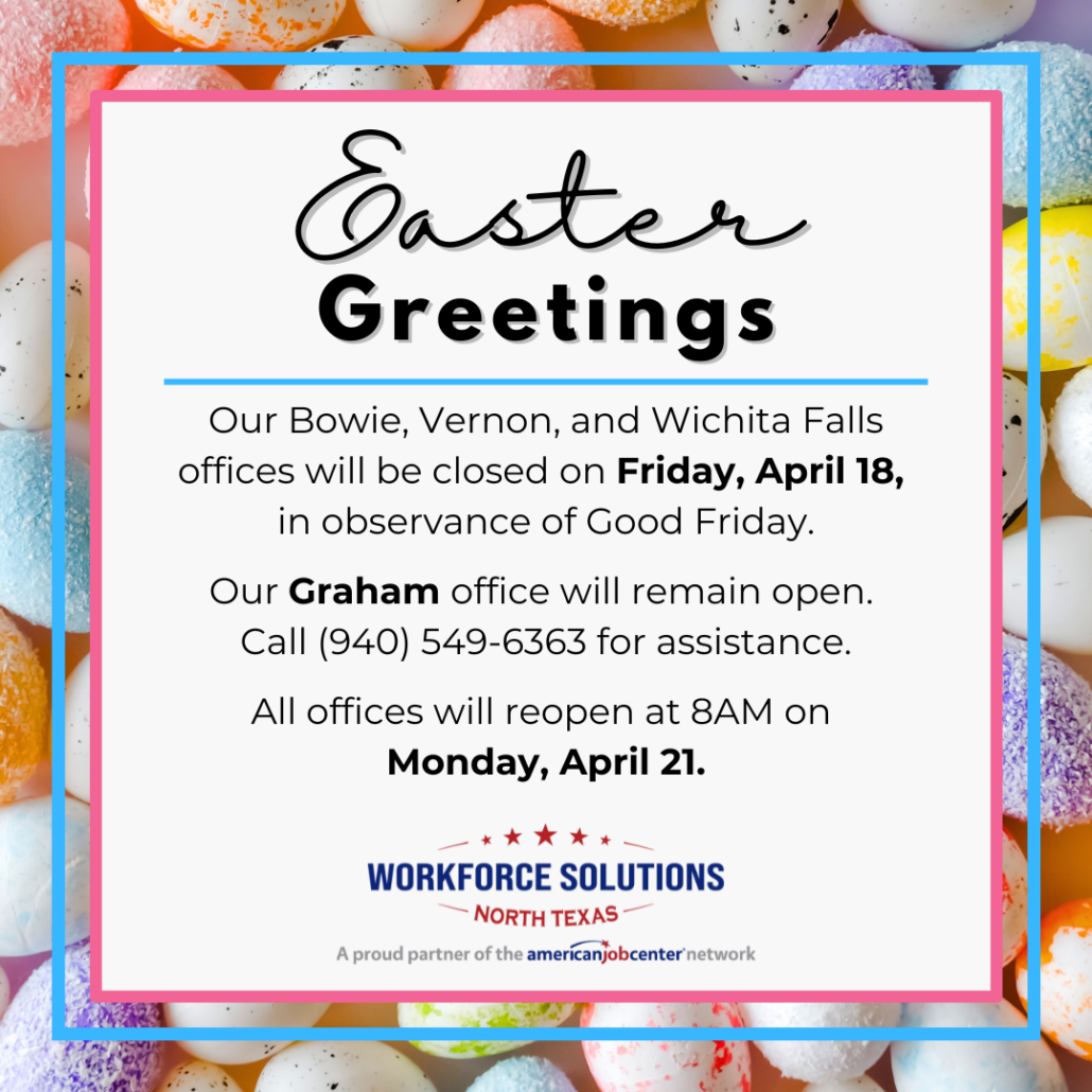 Heads up! Our Bowie, Vernon, and Wichita Falls offices will be closed on Friday, April 18, in observance of Good Friday.