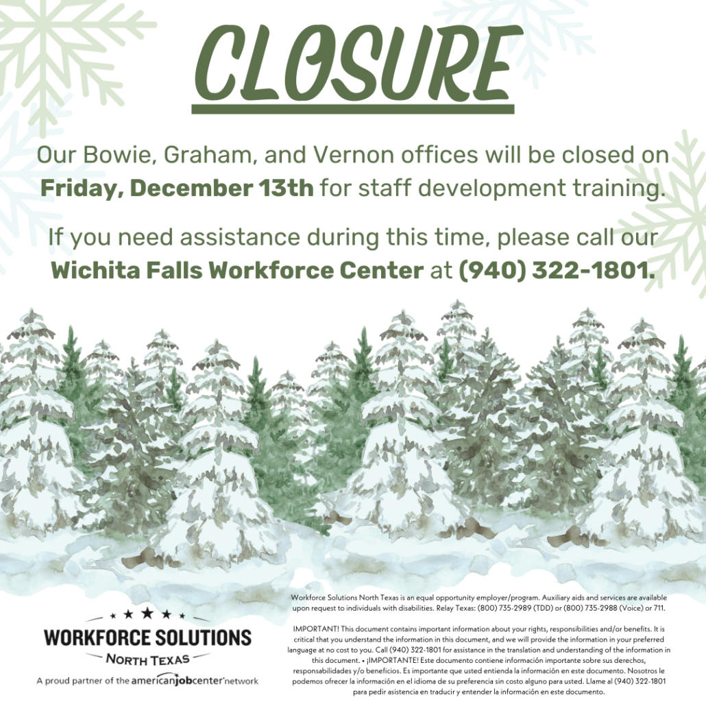 Our Wichita Falls Workforce Center will remain open. If you need assistance during this time, please call (940) 322-1801.