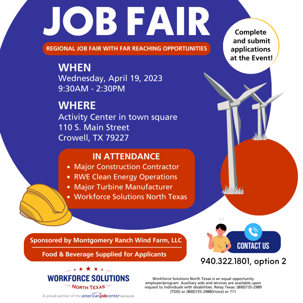 ▶️A job fair will be held at the Activity Center in Crowell at 110 S. Main St. on Wednesday, April 19 from 9:30AM-2:30PM. These companies will be offering premium pay, so do not miss this opportunity to earn!