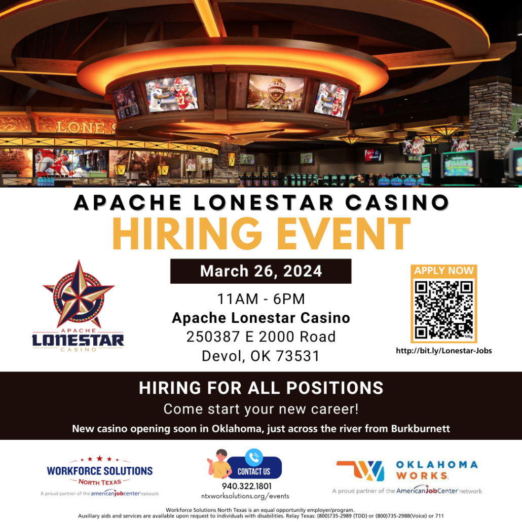 Attention job seekers! Workforce Solutions North Texas is partnering with the brand new Apache Lonestar Casino for a hiring event on Tuesday, March 26th.