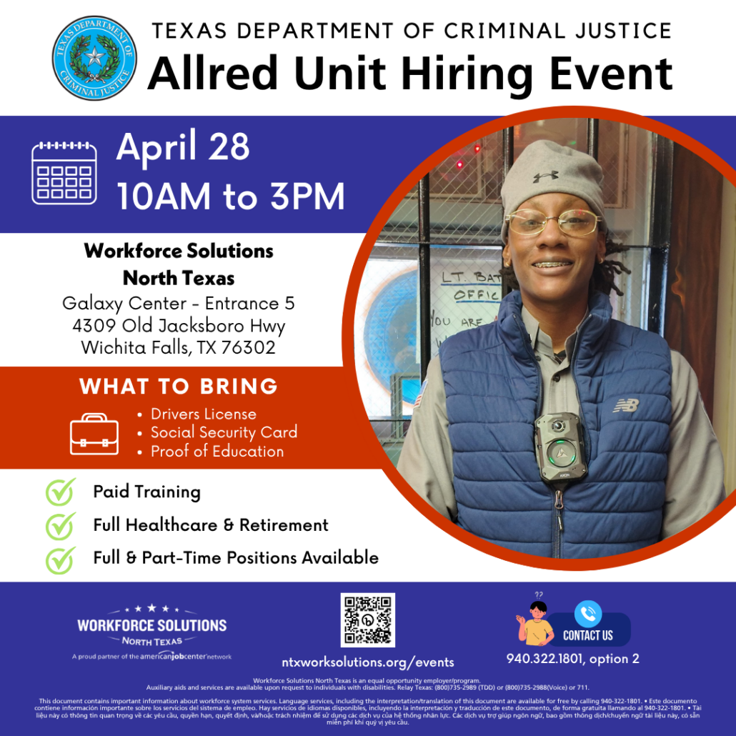 It’s time to start your new career! Workforce Solutions North Texas is hosting a hiring event with the Allred Unit on Tuesday, April 28.