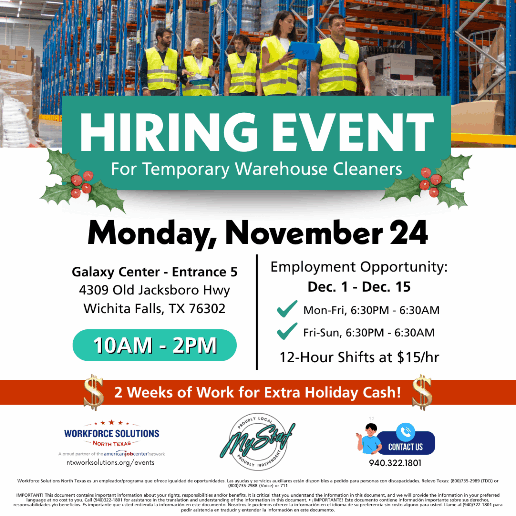 Workforce Solutions North Texas is partnering with MyStaf for a hiring event on Monday, November 24. Join us at entrance 5 of the Galaxy Center (4309 Old Jacksboro Hwy, Wichita Falls, TX 76302) from 10AM-2PM.