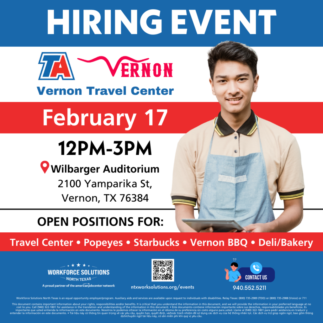 Join us at the Wilbarger Auditorium (2100 Yamparika St, Vernon, TX 76384) from 12PM to 3PM if you’re interested in working at the Vernon Travel Center.