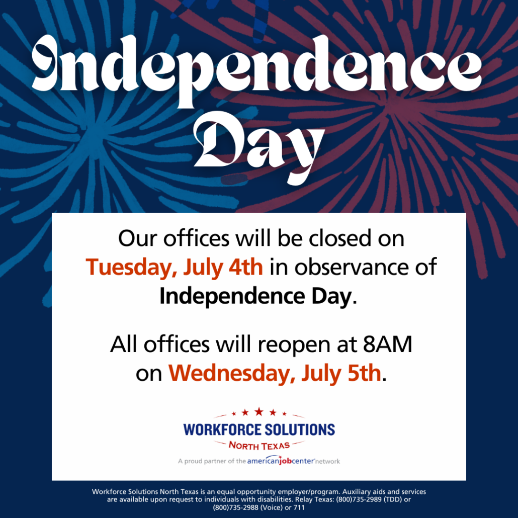 All Workforce Solutions North Texas offices will be closed in observance of Independence Day on Tuesday, July 4th.