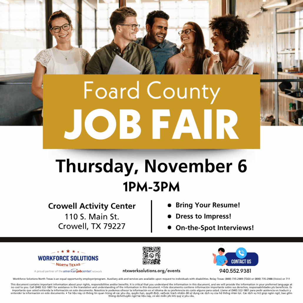 Attention job seekers! Workforce Solutions North Texas is hosting a job fair in Foard County on Thursday, November 6.