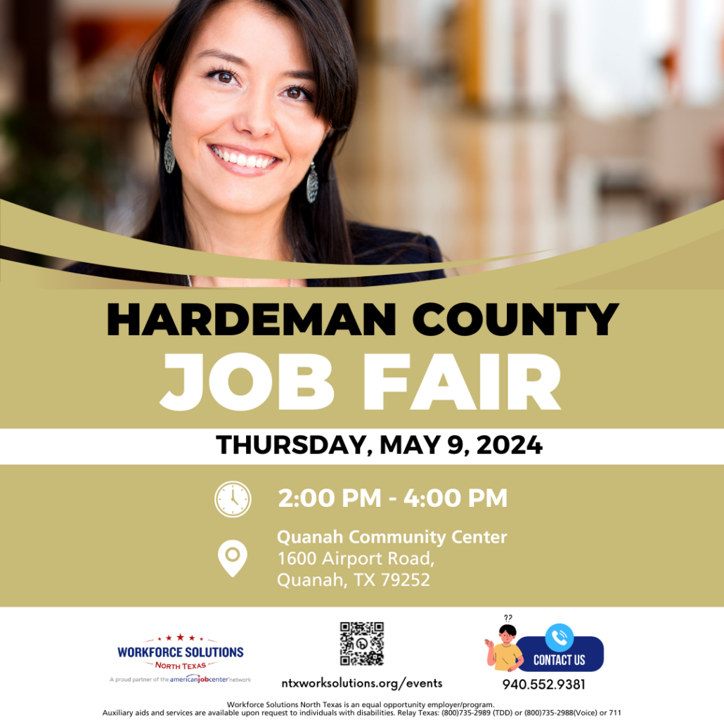 Looking for a new job opportunity? Workforce Solutions North Texas is hosting a job fair in Hardeman County on Thursday, May 9, 2024.