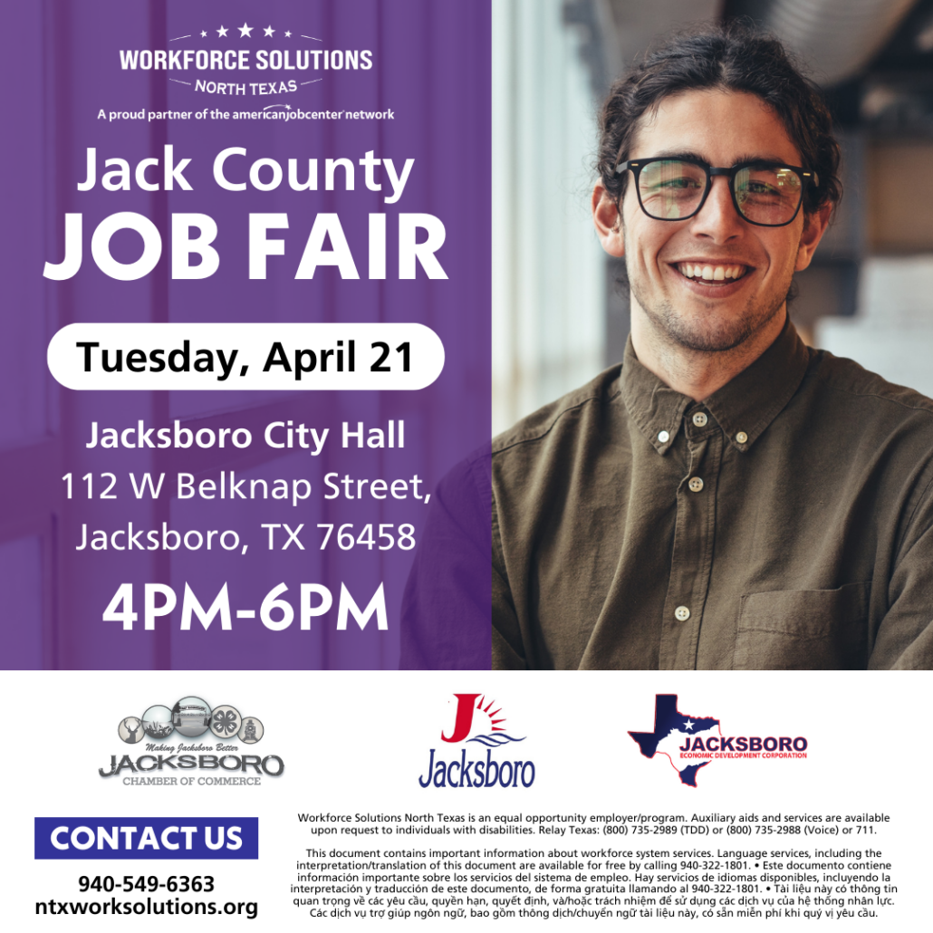 Attention job seekers! Workforce Solutions North Texas is hosting a job fair in Jack County on Tuesday, April 21.