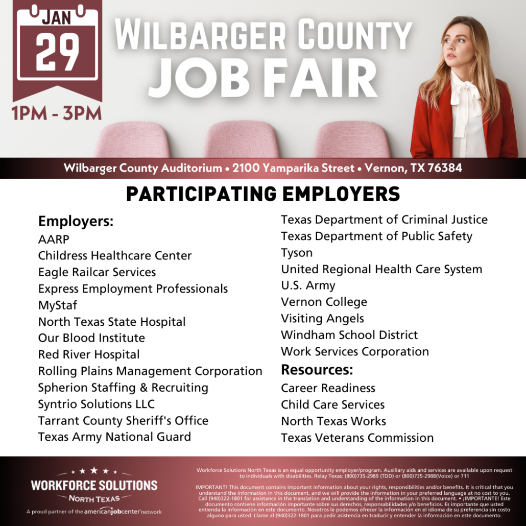 Attention job seekers! Workforce Solutions North Texas is hosting a job fair in Wilbarger County on January 29, 2025.