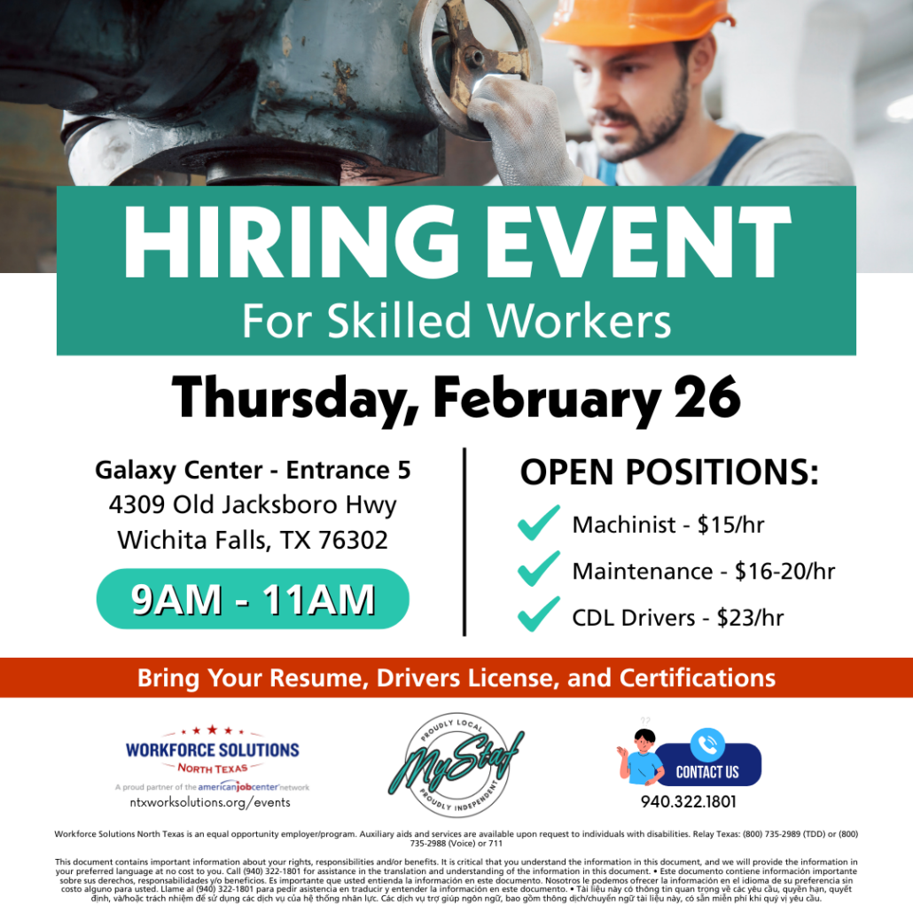 Calling all job seekers! Workforce Solutions North Texas is partnering with MyStaf for a Skilled Workers Hiring Event on Thursday, February 26.