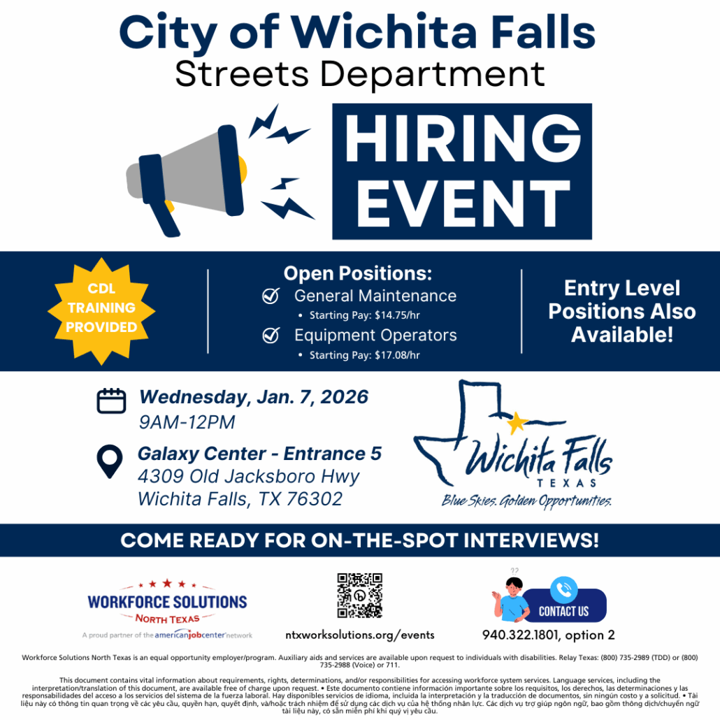 Start the year off with a new career! Workforce Solutions North Texas is partnering with the City of Wichita Falls for a Streets Department hiring event on Wednesday, January 7, 2026.