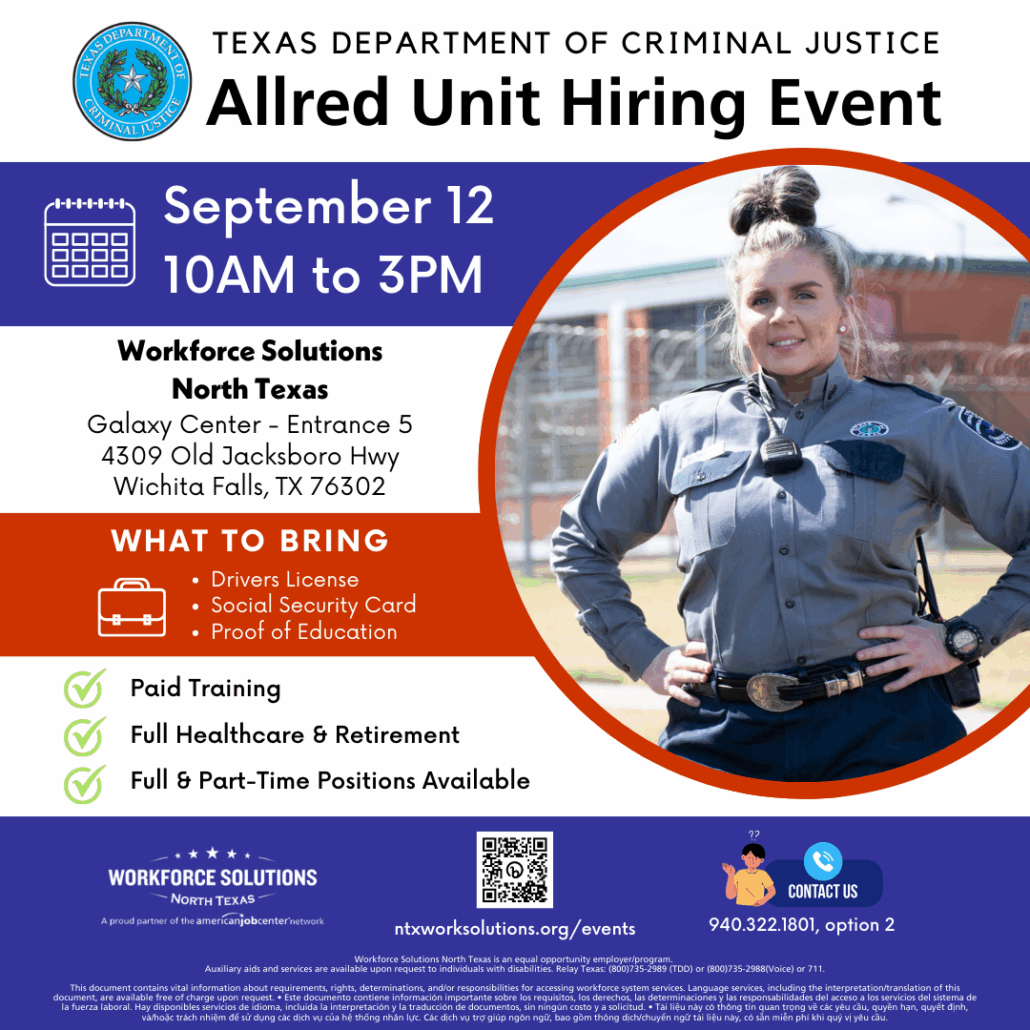 It’s time to start your new career! Workforce Solutions North Texas is hosting a hiring event with the Allred Unit on Friday, September 12.