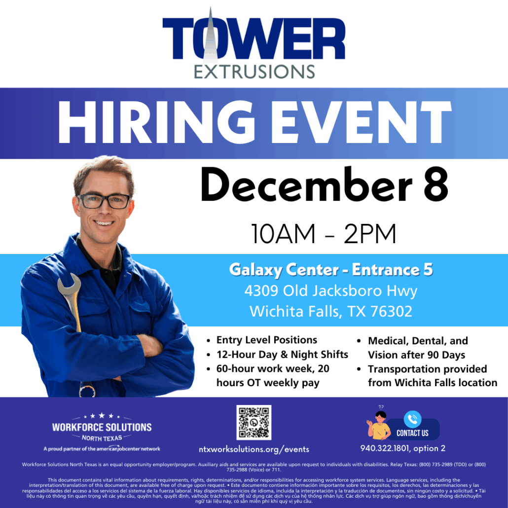 Attention job seekers! Workforce Solutions North Texas is partnering with Tower Extrusions for a hiring event on Monday, December 8.