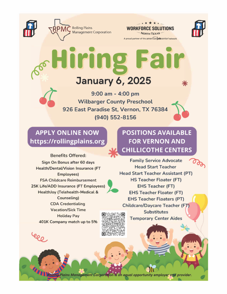 Workforce Solutions North Texas is partnering with Rolling Plains Management Corporation for a HIRING FAIR on January 6, 2025!