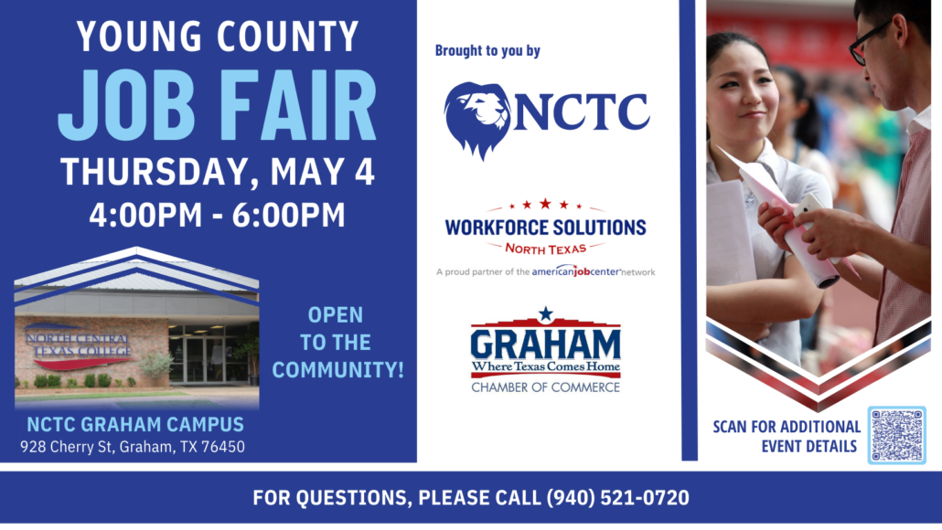 Workforce Solutions North Texas, North Central Texas College in Graham, and Graham Chamber of Commerce are hosting a job fair on May 4th for anyone in the community looking for work!