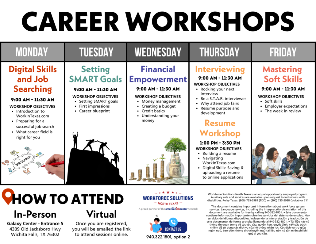 These workshops are available to you for free every week. Please contact Stacey Lingbeek at stacey.lingbeek@ntxworksolutions.org or call (940) 322-1801 (extension 5114) for more information about these workshops or to be placed onto the Job Readiness schedule.